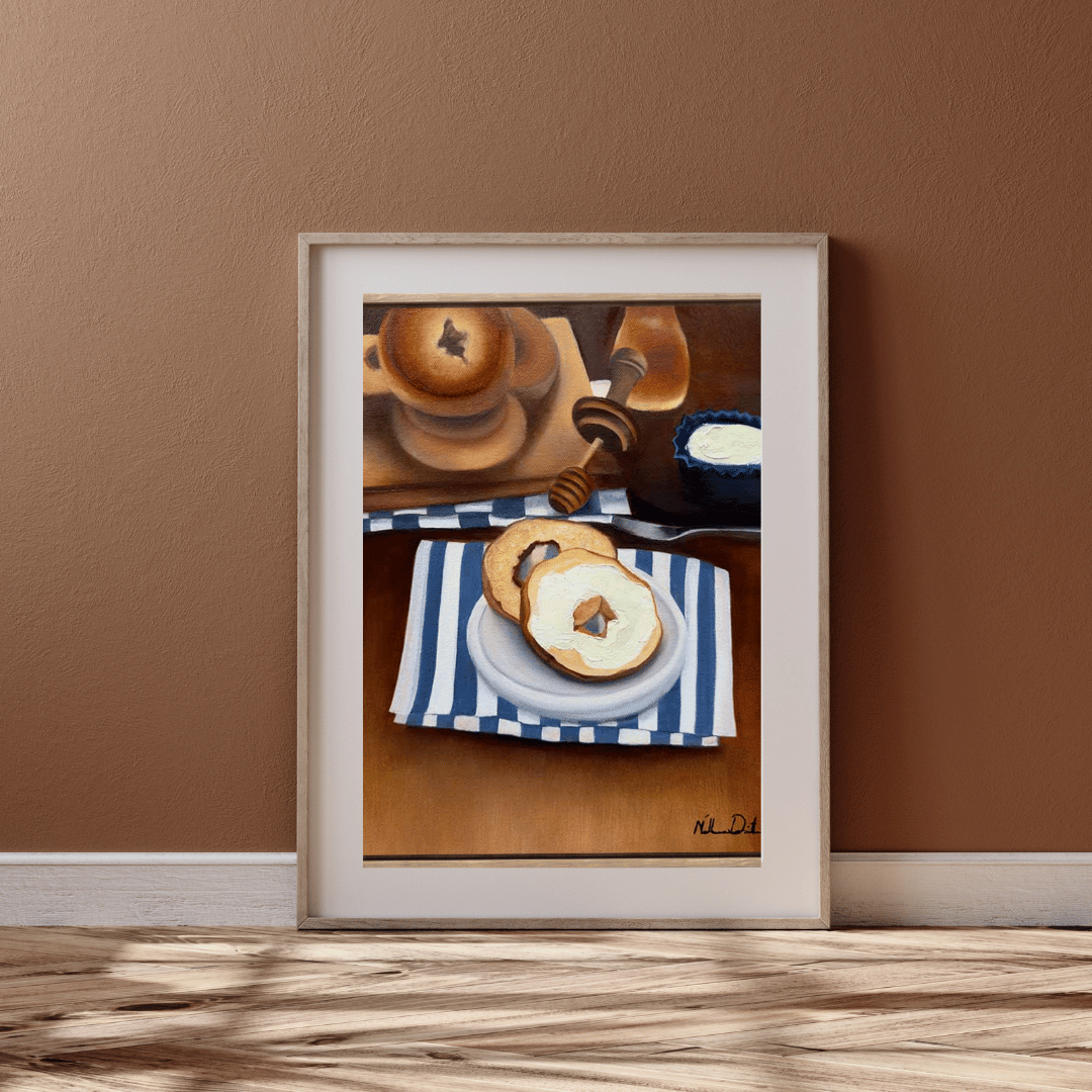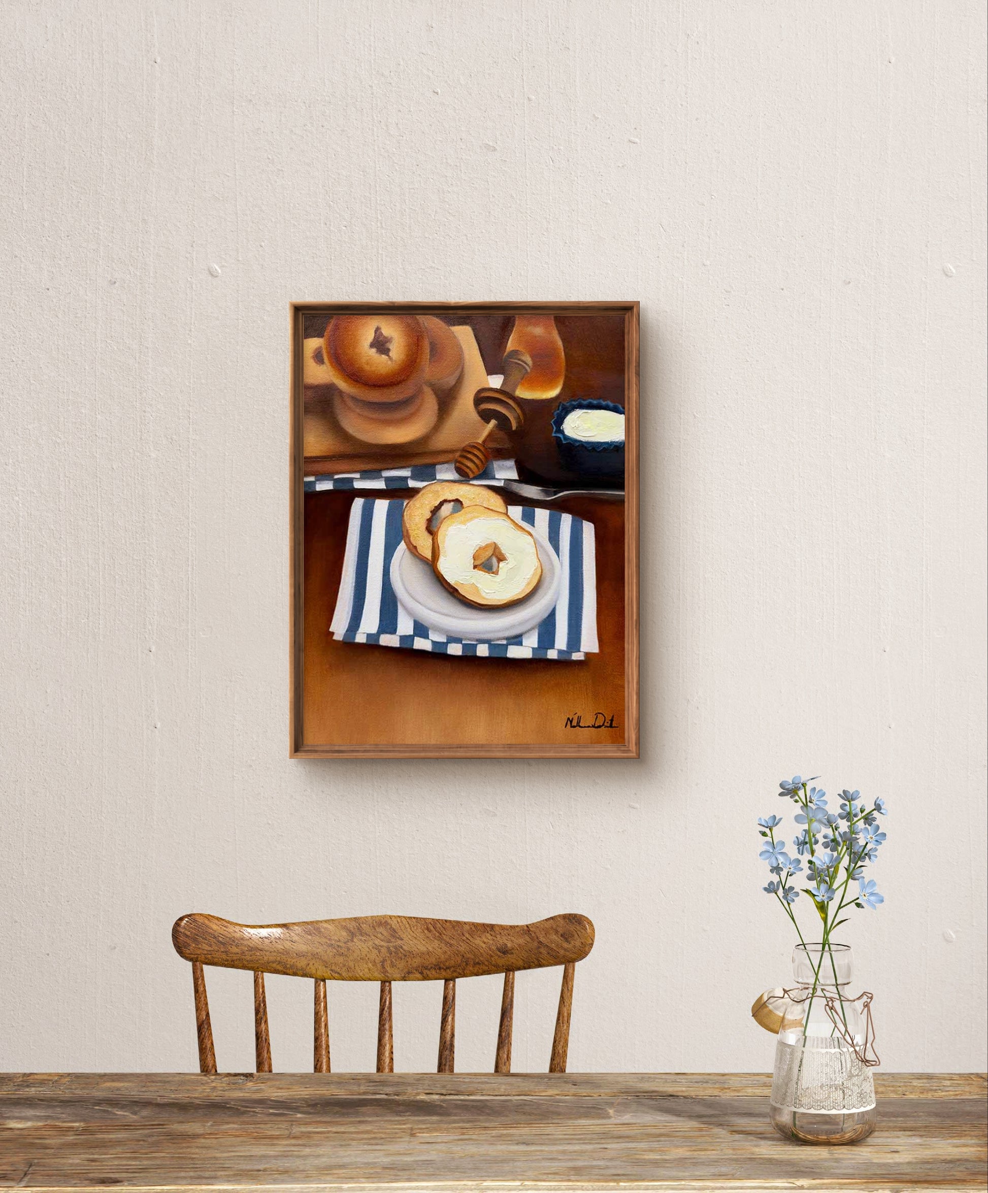 A classic bagel with cream cheese spreads is very charming looking in warm light with sweet honey that feels like home in the morning.